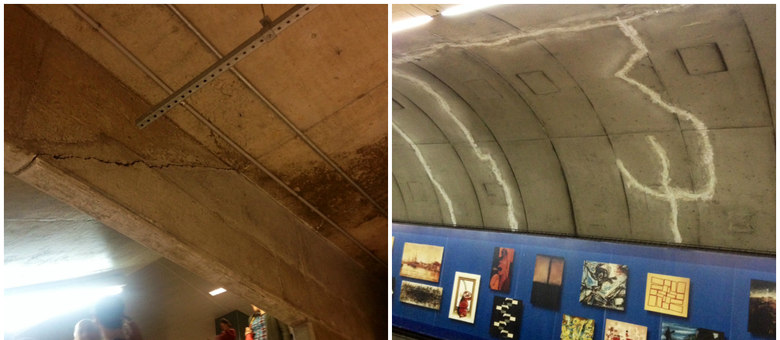 À esquerda, rachadura na estação República, que chama a atenção de engenheiros; à direita foram causadas por infiltração e precisam ser monitoradas sempre Fernando Mellis/R7